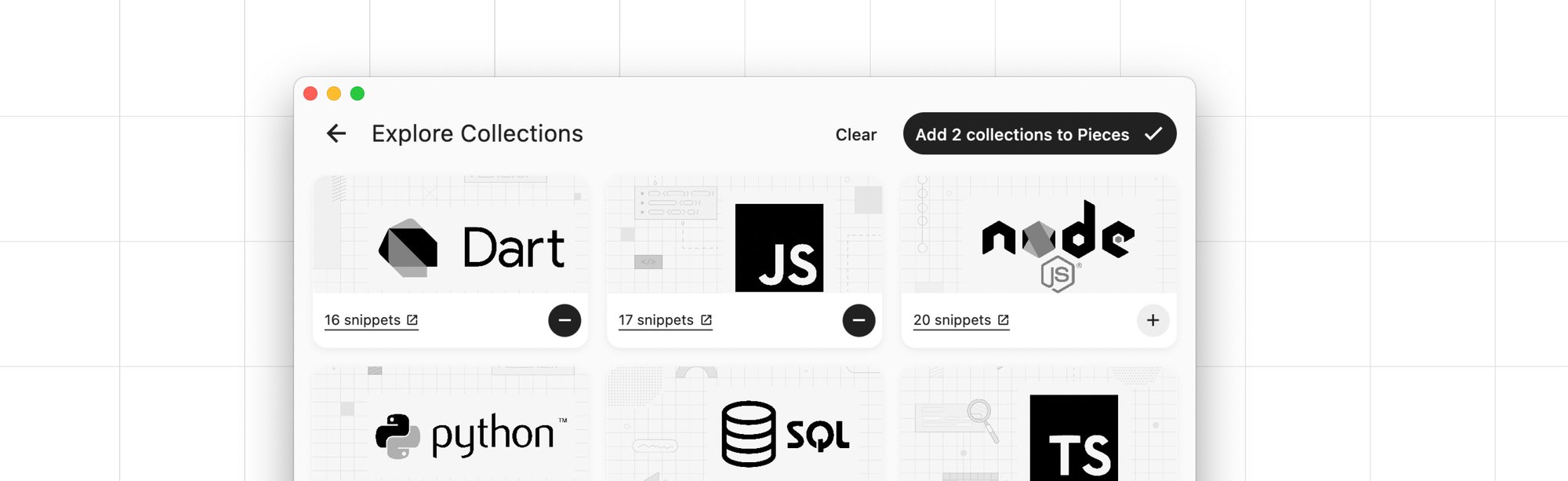 To add a collection, hit [Shift+Cmd/Ctrl+C] from within the Pieces desktop app or visit code.pieces.app/collections. With a single click, you’ll be able to instantly add collections or read more about each snippet and its related context.