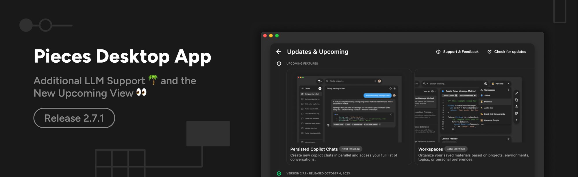 Our team pushes product updates a LOT. To help keep track of recently released improvements and upcoming features, check out our brand new “Updates & Upcoming” view! You can explore a timeline of our newest releases to learn more about existing features sprinkled throughout the Pieces Desktop App.