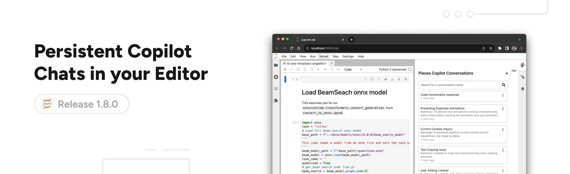 Persistent Pieces Copilot conversations are now available in Pieces for Developers JupyterLab! Thanks to our shared Pieces Copilot dependency, this functionality is shared among our integrations.