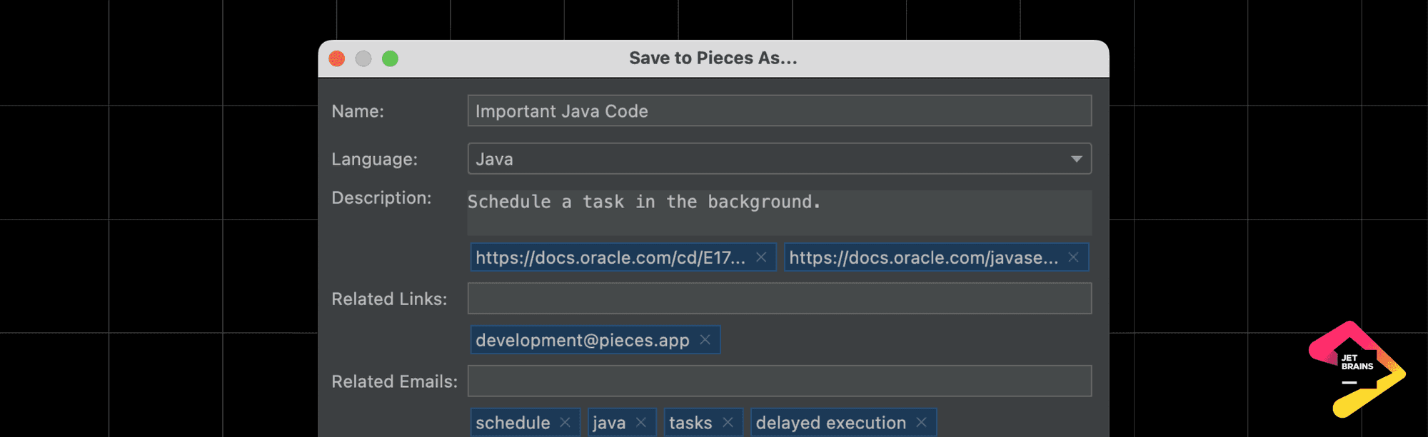 The most valuable features of Pieces are quickly saving snippets and effortlessly enriching them. Today, we’re introducing an additional method to save and enrich your snippets in JetBrains: Save to Pieces As.