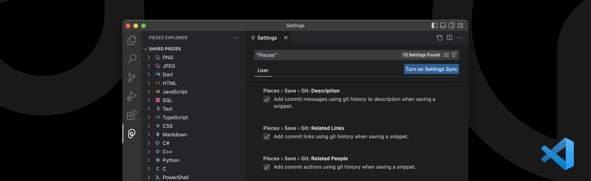 Now it is. When you save a snippet from code that has been in a Git repo, Pieces auto-magically associates commit messages, commit authors, project and file names and more. (Choose which context you want to capture in the Pieces for VS Code settings!)
