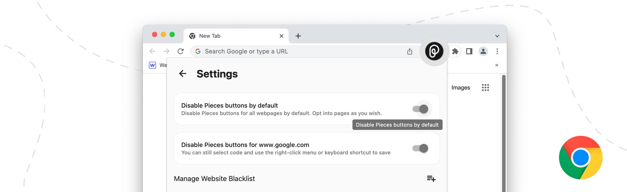 If you have buttons automatically enabled, you can easily disable the Pieces buttons on specific sites in the extension settings— same with enabling the buttons on specific sites if you disable the buttons by default.