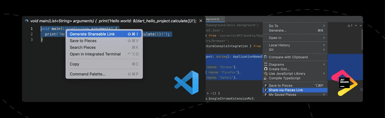 Today’s releases for VS Code and JetBrains bring the power of single-click snippet sharing to your editor! Now you can highlight any code in your editor, right-click to generate a Pieces shareable link and share anywhere, all without even having the Pieces desktop app open! Your recipients get all that context right alongside the code - including the file name, the line numbers and auto-generated tags.